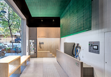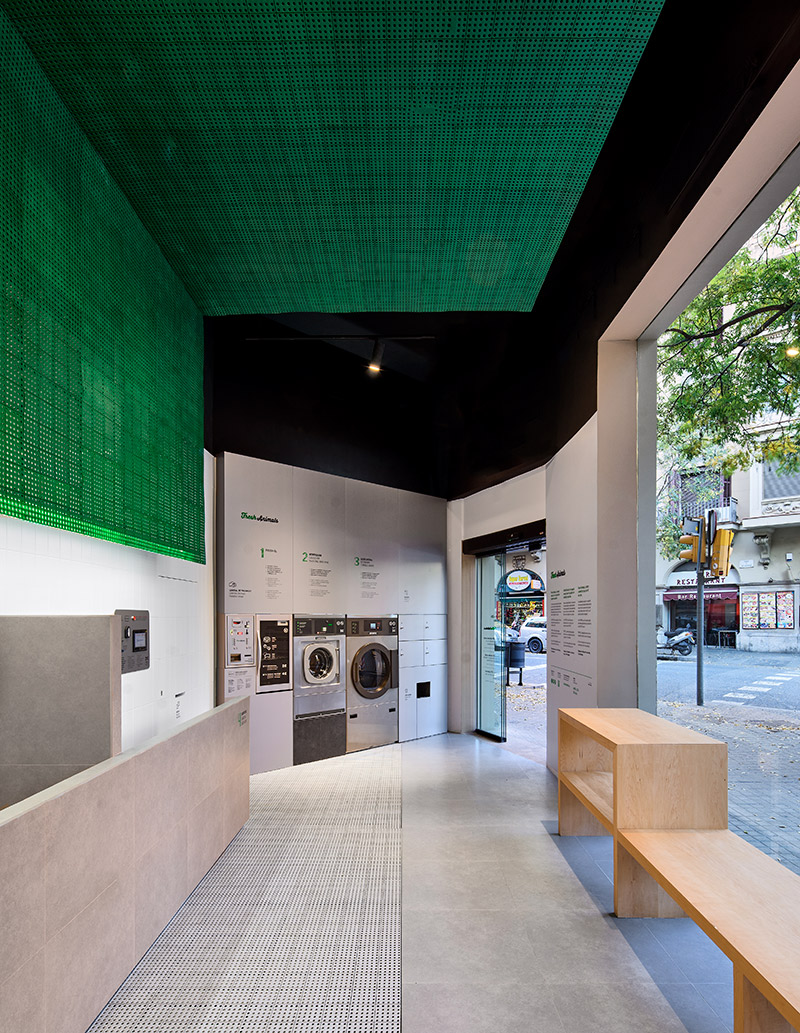 L’establiment s’ha personalitzat amb l’ús de les llosetes de pvc, material amb què tradicionalment es pavimenten les zones humides dels vestidors esportius. De color gris o verd, aquí es fan servir com a terra i com a làmina suspesa que recull les banyeres, l’element central de l’espai.